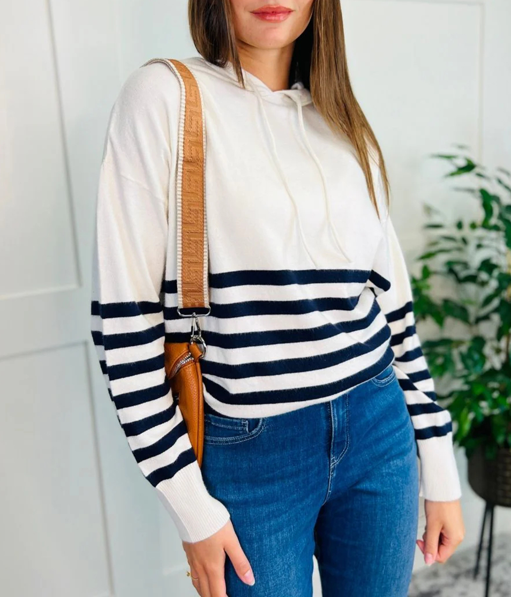 Made with soft knit material, this jumper features a partial striped design and a functional drawstring at the hood. Perfect for those chilly days, this jumper will keep you warm and fashionable.