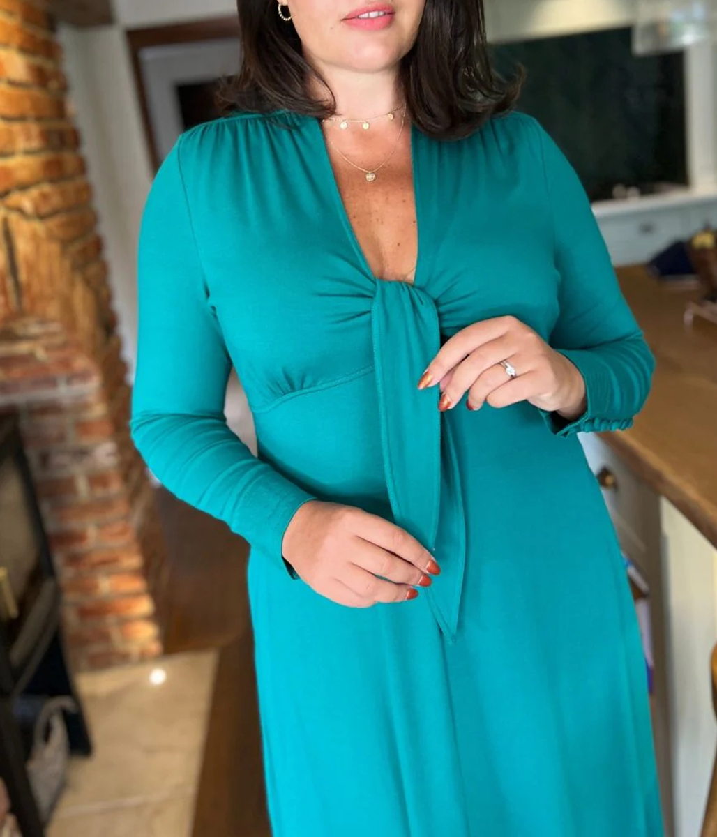 Made with stretch jersey for a comfortable fit, the V neck with tie detail and gathering to the shoulders add a touch of sophistication. In seam pockets and long sleeves with button detail make this fit and flare dress both functional and stylish.